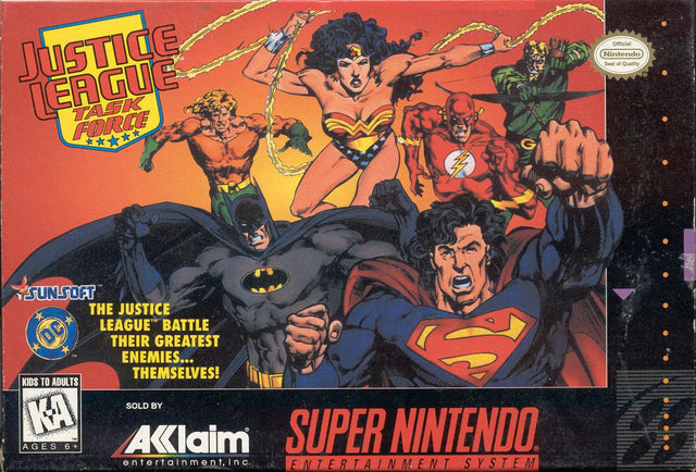 Unite Earth's greatest heroes in Justice League Task Force, a 2D fighting game for the Super Nintendo! Choose from an iconic roster of DC Comics characters, including Batman, Superman, Wonder Woman, The Flash, and Green Lantern, as they battle against Darkseid's forces. Each hero possesses their signature powers and special moves, allowing for diverse fighting styles. The game offers classic one-on-one combat in various themed arenas. Justice League Task Force delivers a straightforward fighting experience for fans eager to pit their favorite DC heroes against each other in a battle for justice.